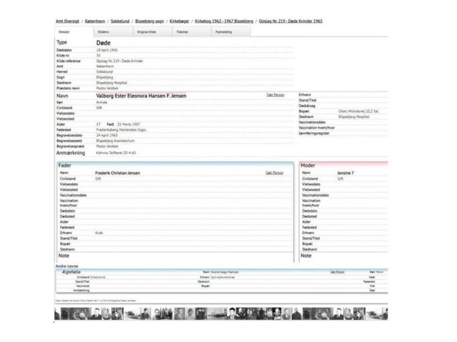 Jeg er logget ind som bruger og får derfor også at vide, hvem der var hendes forældre: Frederik Christian Jensen og Jensine, samt hvem hun var gift med: Svend Aage Hansen sporvejsfunktionær.